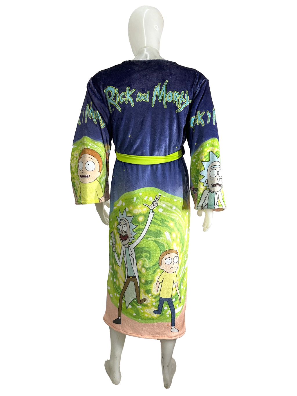Sumergite en el multiverso con esta bata estilo kimono inspirada en Rick and Morty. Confeccionada en tela de polar ultra suave, presenta estampas vibrantes de Rick, Morty y paisajes cósmicos que capturan toda la locura y humor de la serie. Ideal para usar en casa, después de la ducha o como prenda temática. Incluye cinturón ajustable en color neón que le da un toque único y divertido.
